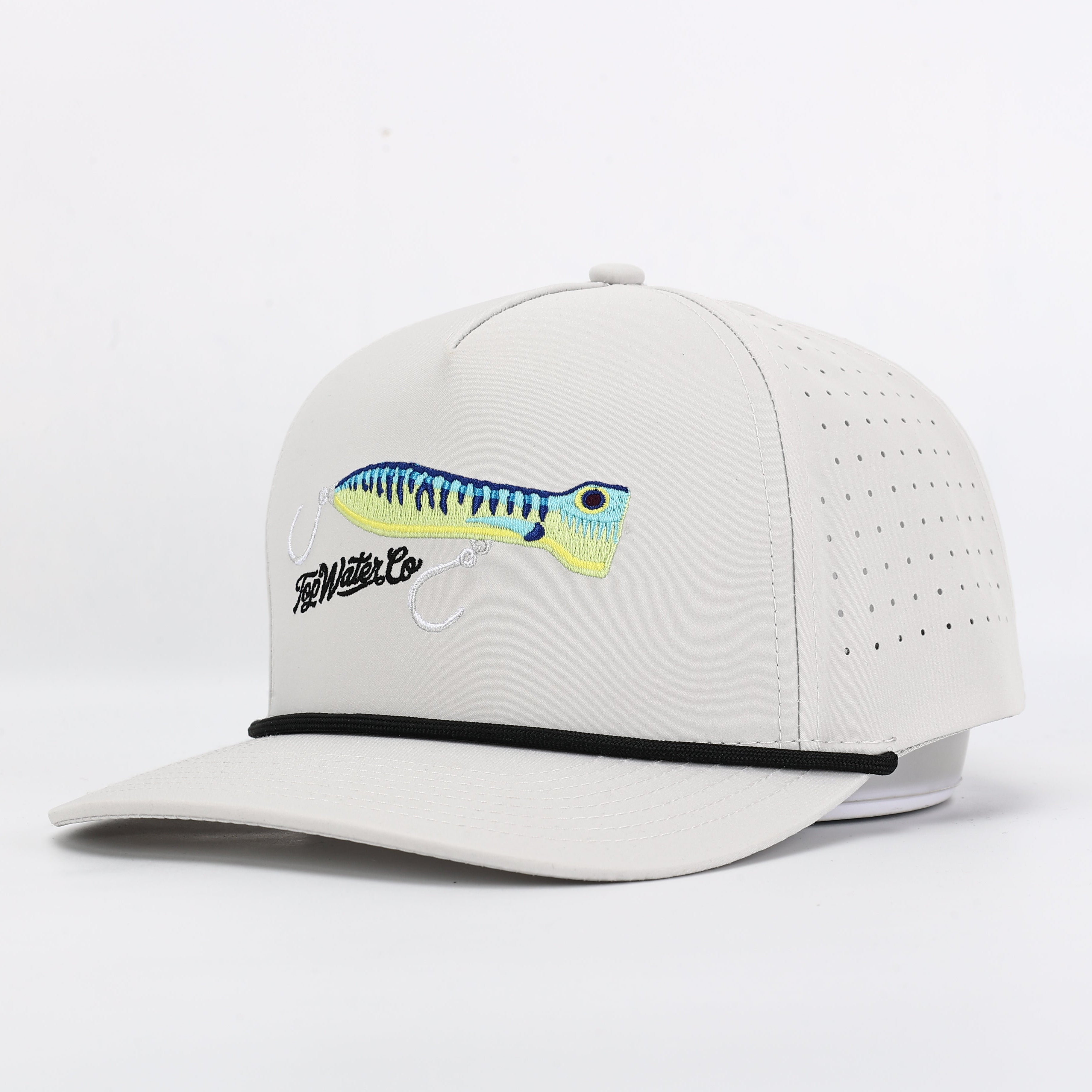 Inspired by chug bugs, tuna poppers, and every topwater bait that gets smoked the second it hits the water, this golf-style rope hat blends performance, comfort, and clean design into one everyday staple. The embroidered popper graphic up front is a statement piece for anglers who live for surface strikes.