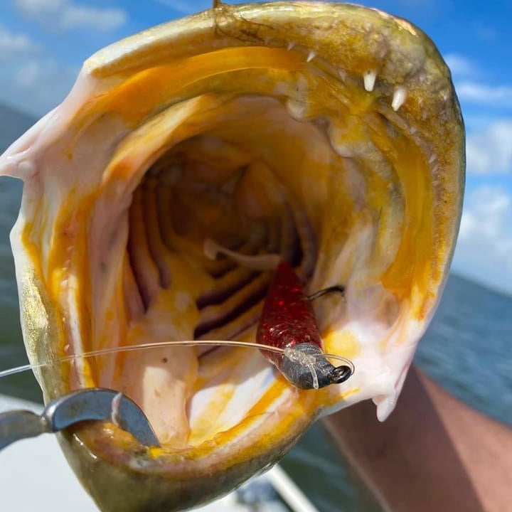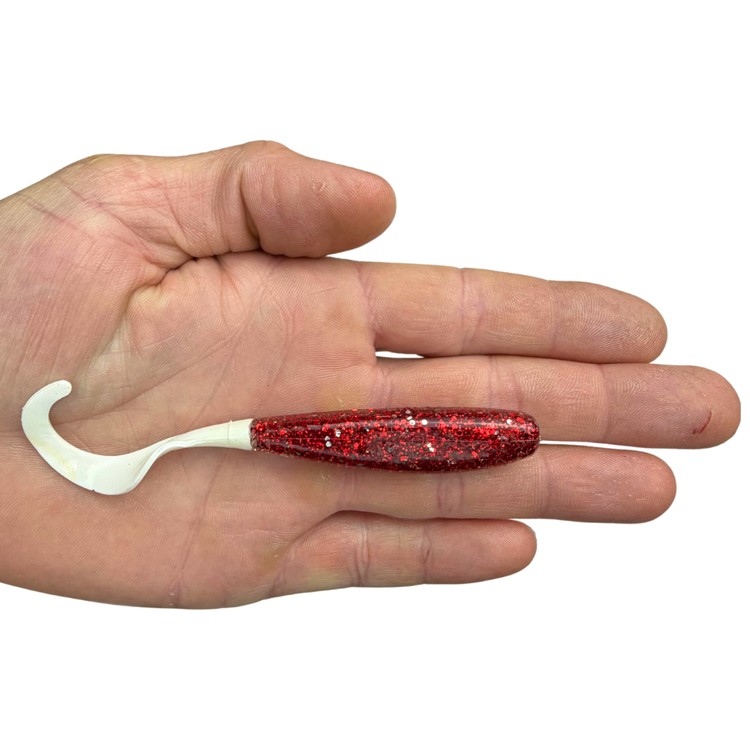 Pretty much works in everything, clear to murky water, deep to shallow, sunny to overcast, etc. It’s got a touch of silver glitter mixed in with the red for the body and a red glowing tail.