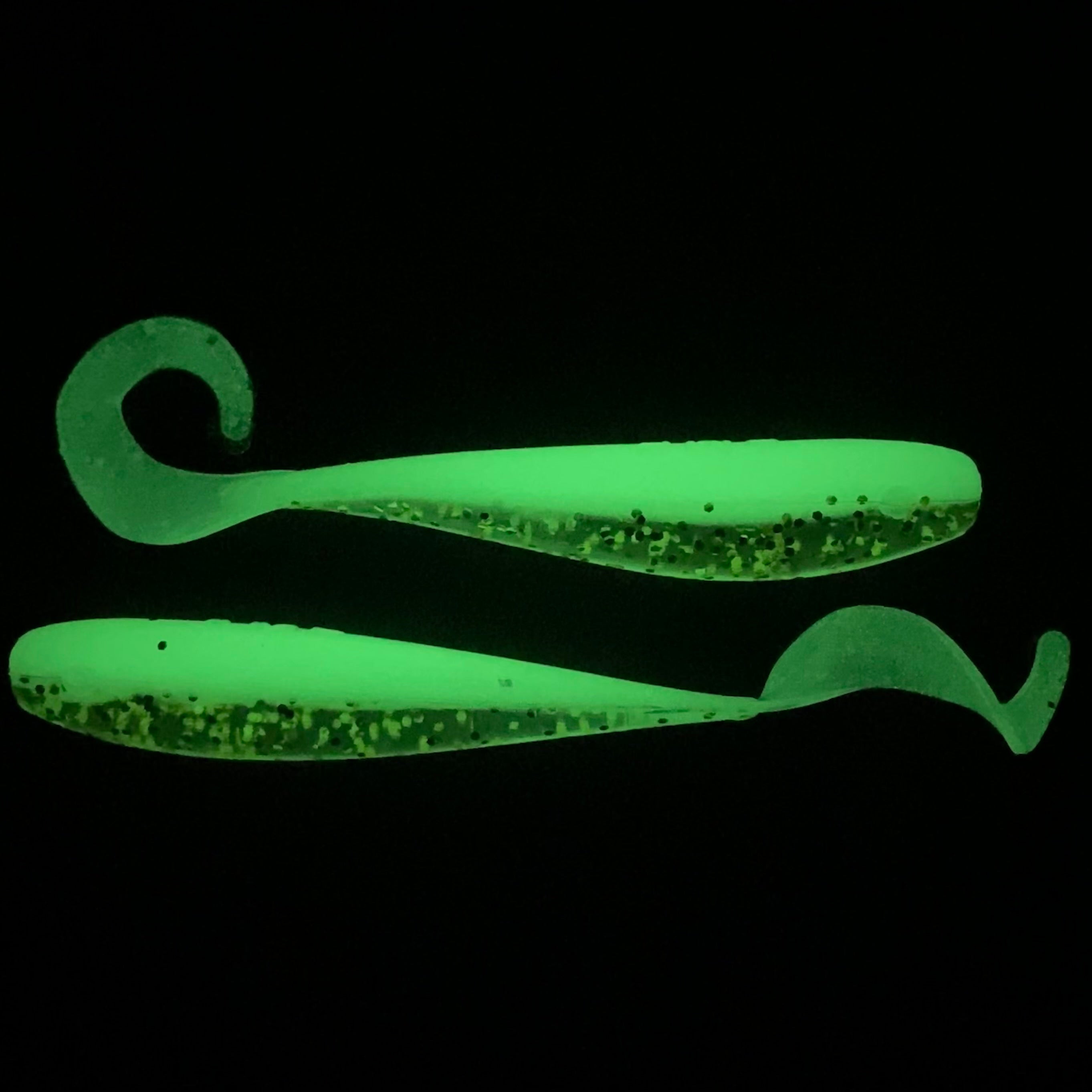 Gold shimmering UV reflective top that glows green with a translucent gold glitter belly, makes for another fantastic clear water-sight fishing color, performs well in low light scenarios due to its UV reflectiveness, our favorite for sunrise/sunset!