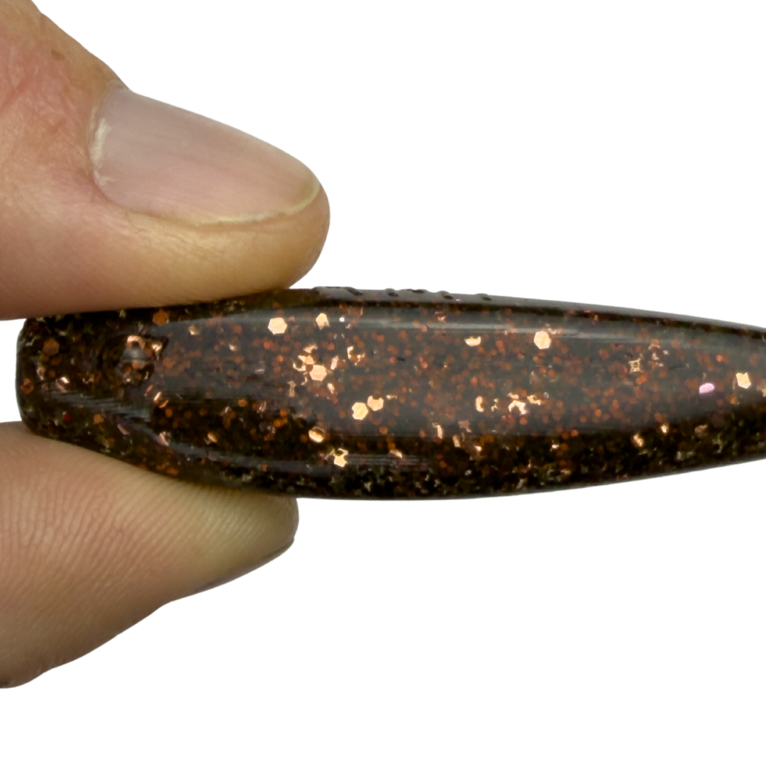 Deep brown rootbeer, with a little copper, made entirely of glitter which gives you a dark color with a ton of shimmer, plus it glows green, paired with a chartreuse tail that also glows green!